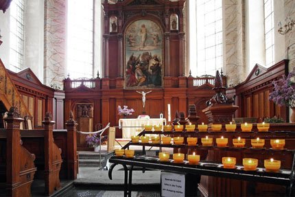 Een deel van het interieur van de St.Nicolai kirche met blik op het altaar.